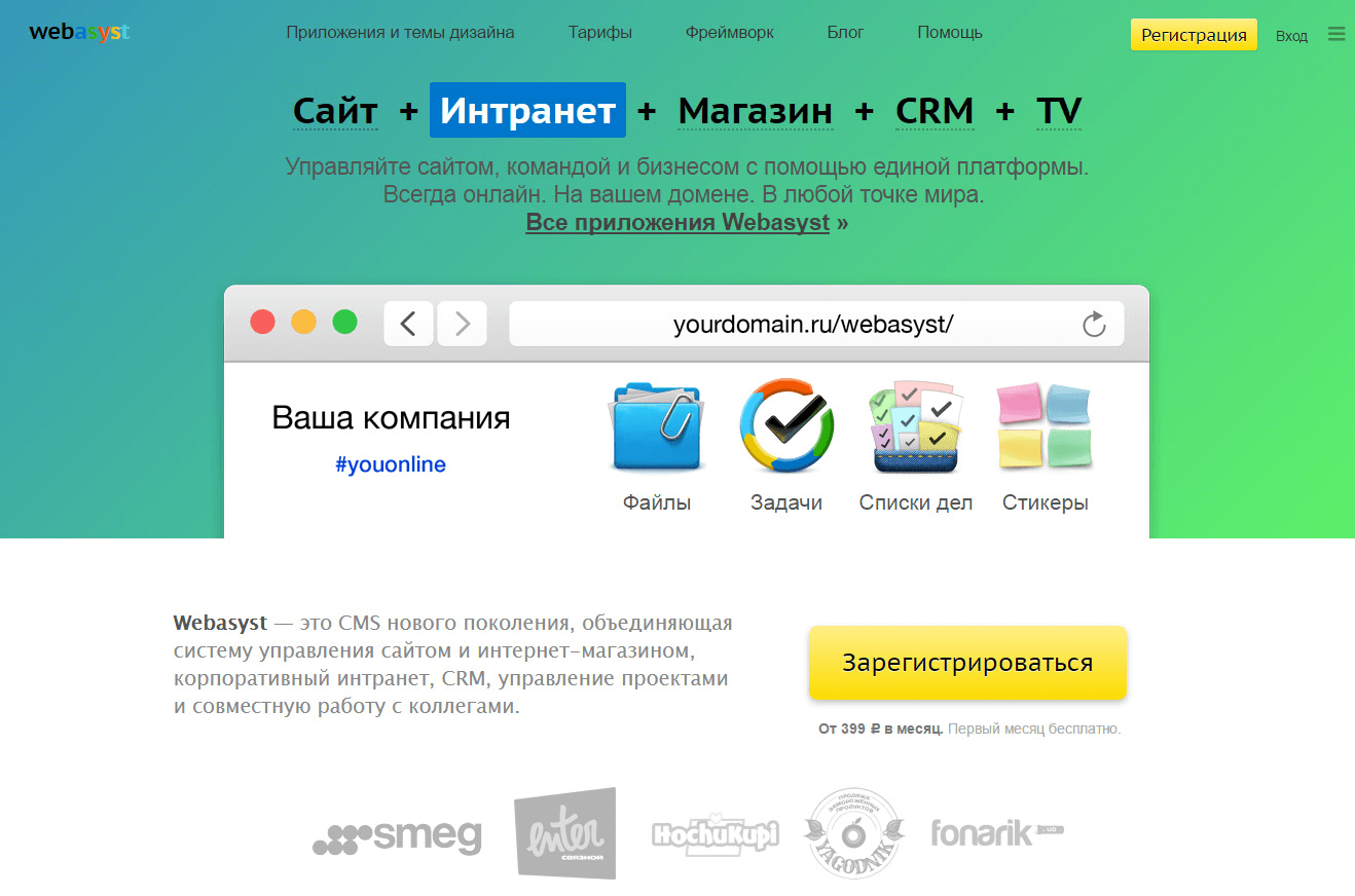 Все это полностью доступно в онлайн-пространстве, притом по очень доступным ценам. За первый месяц работы плата не взимается вообще. В слитный комплекс входят управление сайтом, интернет-торговлей, корпоративный интранет, СРМ, управление проектами и задачами различного рода. Главное, чтобы в каком-то устройстве был работающий интернет (даже телевизор подойдет), а все остальное доступно!