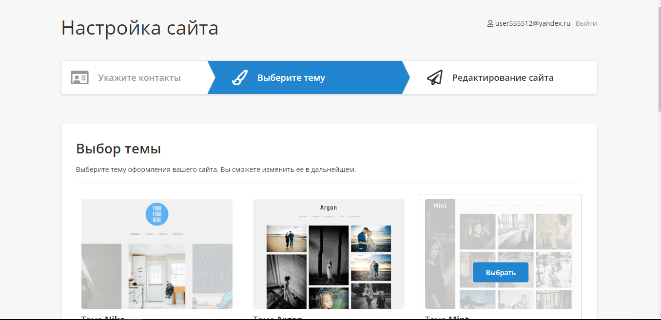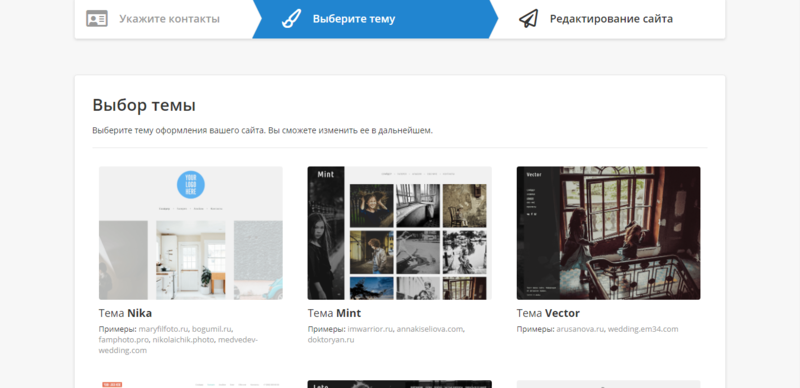 Далее выбираем из представленного списка тему оформления вашего будущего сайта. Шаблонов всего 10 и, качество исполнения каждого определённо высокое. Всех объединяет общий минималистический стиль, но структура и подача контента у всех разная. Под каждым шаблоном можно увидеть примеры реальных сайтов с данной темой. Дизайн сайта можно сменить в любое подходящее время, так что вы можете опробовать все темы и найти самую удобную для себя.