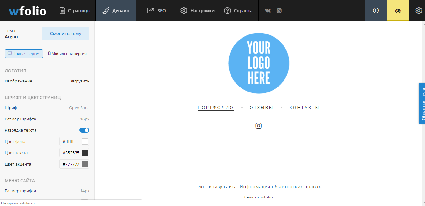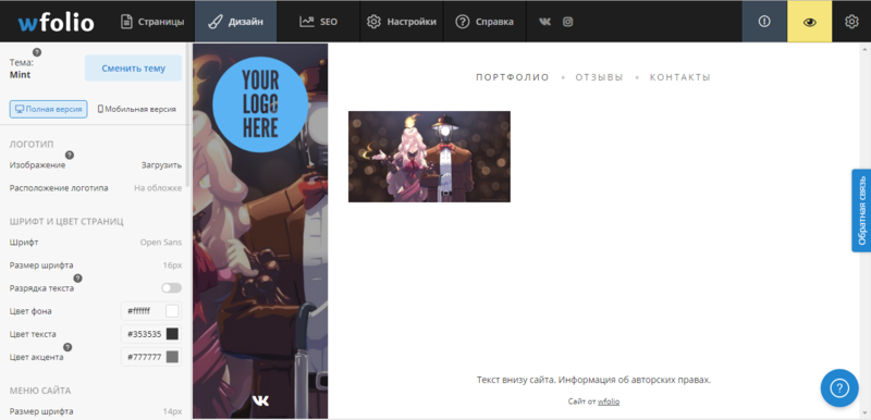 Во вкладке “Дизайн” расположен визуальный редактор сайта. Здесь можно сменить тему, загрузить свой логотип и выбрать его расположение. Кастомизация очень гибкая, здесь есть все настройки дизайна: шрифт и его размер, цвет фона, текста и акцента, размер меню. Здесь же можно работать с вашими галереями фотографий, настроить ваши альбомы. Отсюда же можно добавить кнопки ваших социальный сетей.
