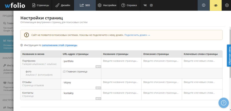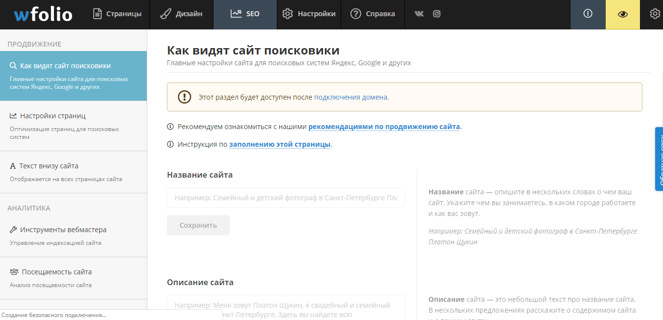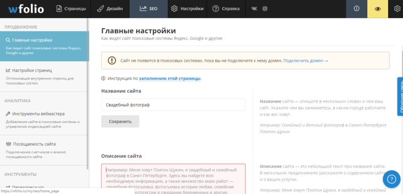 Дальше идет вкладка “SEO”, которая поможет продвигать ваш сайт в поисковых системах. Сначала идут главные настройки сайта, где нужно будет заполнить название вашего сайта, его описание и ввести ваши ключевые слова. От этой информации будет завесить то, как будут видеть поисковые боты ваш сайт.