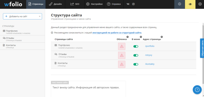 После этого, сразу же откроется панель управления сайтом. На вкладке “Страницы” можно будет настроить структуру сайта. Здесь представлены все имеющиеся страницы сайта и их содержимое. Отсюда вы сможете добавить на сайт новую страницу, альбом с фотографиями и видео, слайдер, галерею, блог, или прикрепить ссылку на внешний сайт. Для каждой страницы можно загрузить обложку и настроить её видимость. Также, здесь можно прописать ваш текст, который будет виден внизу вашего сайта.