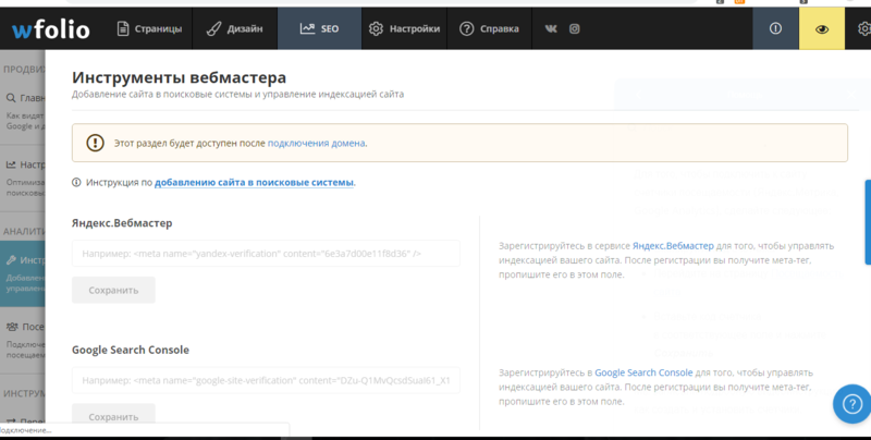 В разделе “Инструменты вебмастера” есть возможность подключения счетчика посещаемости Яндекс.Метрика и Google Analytics. Для этого вам нужно будет вставить специальный код с личных кабинетов поисковых служб в специальную форму. Так вы сможете управлять индексацией вашего сайта и видеть популярные запросы, по которым посетители будут попадать на ваш ресурс.