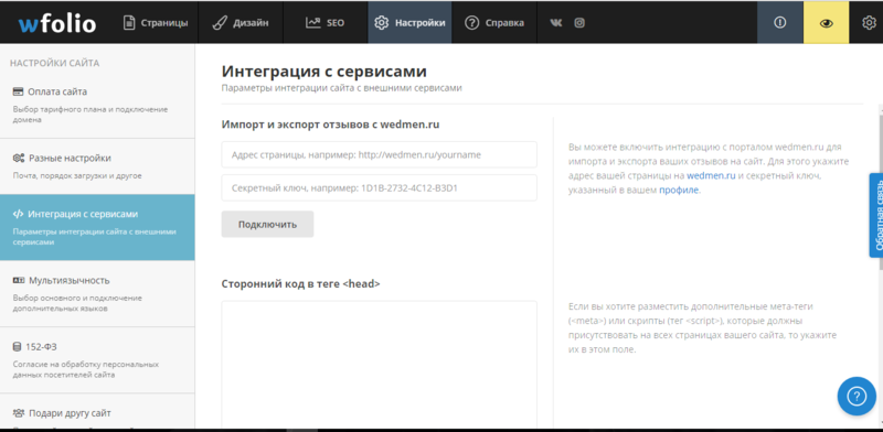 В настройках сервиса вы сможете оплатить ваш сайт и подключить к нему доменное имя. Если его у вас нет, вам помогут подобрать домен и зарегистрировать его. Также здесь можно подключить к вашему сайту внешние сервисы и вставить сторонний код вместе со скриптами.