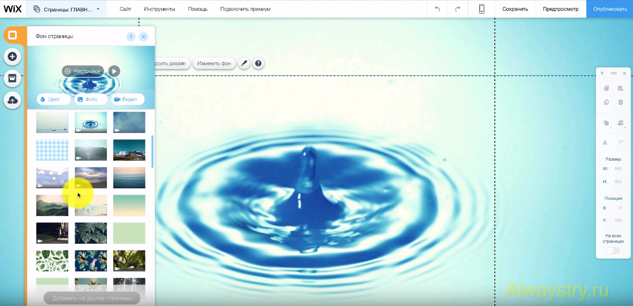 Фоном может служить просто цвет, фото или видео, загруженное вами или взятое из библиотеки Wix. Скорость воспроизведения можно настроить и добавить разные эффекты. Также к фону можно применить эффект параллакса, т.е. при прокрутке страницы отдаленные объекты относительно близко расположенных будут замедляться., это придаст глубины.