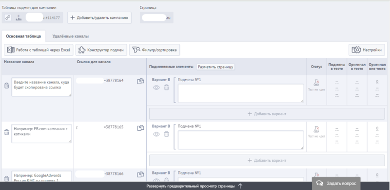 После проверки кода, откроется страница настройка связи. Здесь нужно будет редактировать подменяемые элементы. Слева будут находиться ваши ключевые слова из объявлений. На другой стороне будут варианты замены, которые будут выводиться вместо стандартных, если посетитель зайдёт поэтому объявлению. Вам будет необходимо прописать все заголовки и подзаголовки по всем рекламным объявлениям.