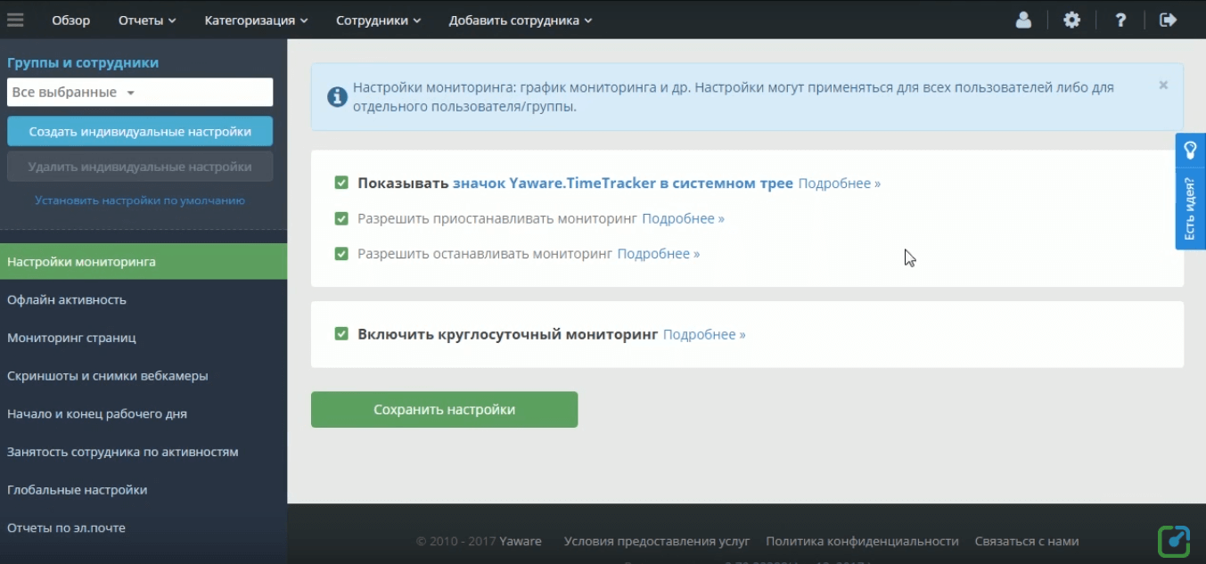 yaware.ru показывает то время, которое сотрудники потратили на работу (а не на смотрение в окно или друг на друга, переговоры между собой, приведение рабочего места в порядок и т. д.). Система может быть развернута не только на обычных ПК, но и на рабочих местах под управлением Линукс, и даже на Макинтошах.