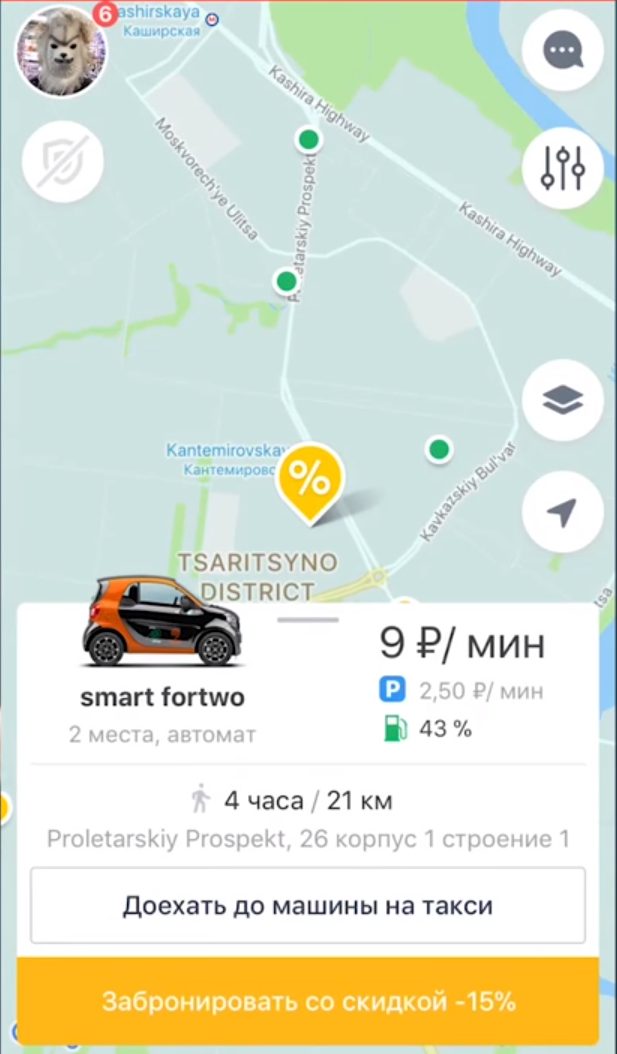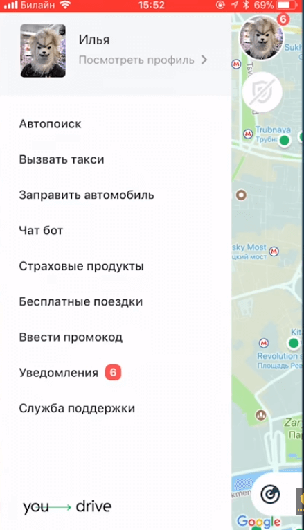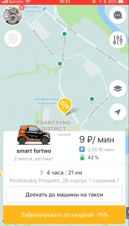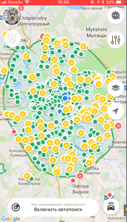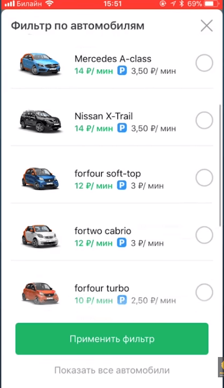 Как вы пройдете авторизацию в сервисе, на карте приложения можно посмотреть все свободные машины в вашем городе.