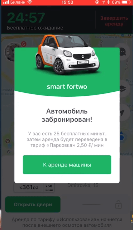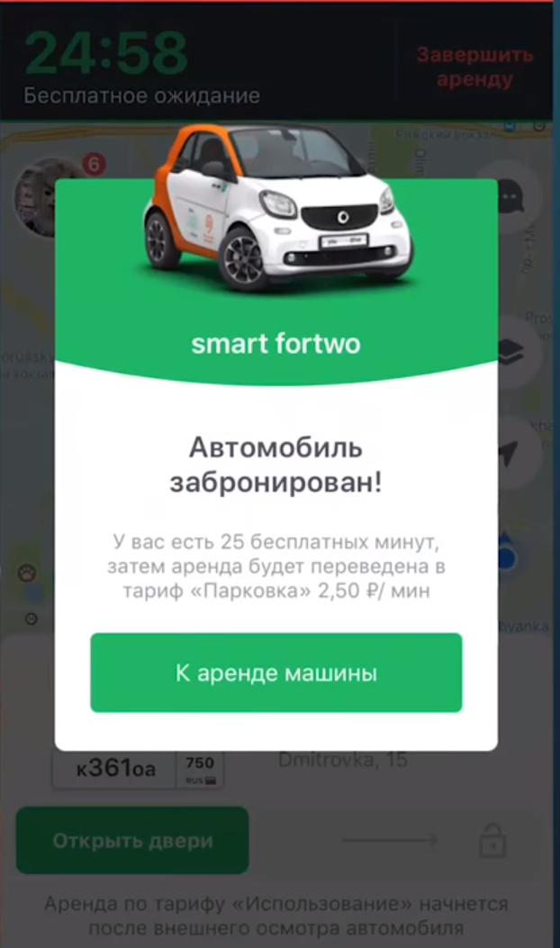 Если вас все устраивает, то нажимаем кнопку бронирования. Вам дадут 25 минут бесплатной брони, за это время нужно найти машину и активировать аренду. Бронировать машины бесплатно можно раз в 2 часа, в других же случаях будут списываться деньги в зависимости от времени ожидания.