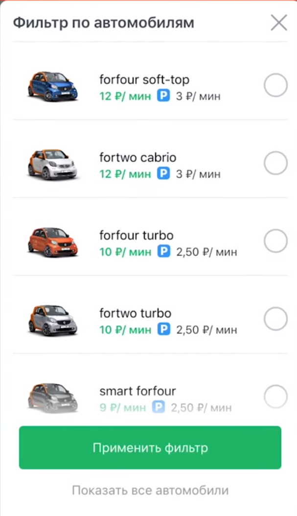 Также здесь можно включить фильтрацию автомобилей по моделям. В этом окне под каждым авто написана стоимость аренды и ожидания.