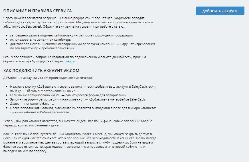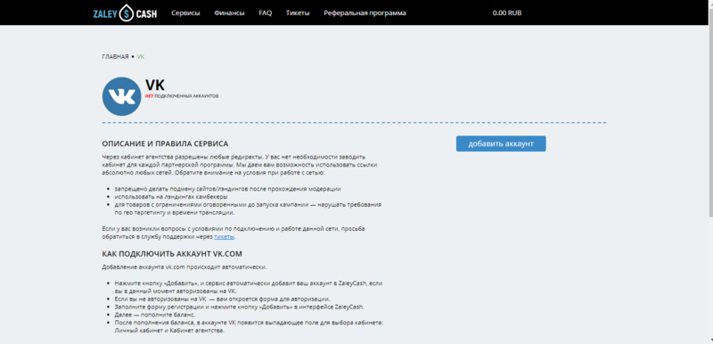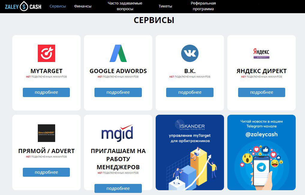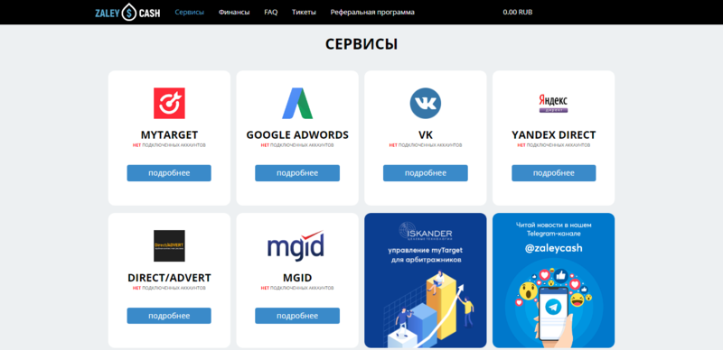 Zaleycash - это сервис, который позволяет пользователям пополнять и управлять балансом площадок для закупки трафика. При этом все действия выполняются со своего личного кабинета, через который можно подключить неограниченное число аккаунтов к рекламным сетям.