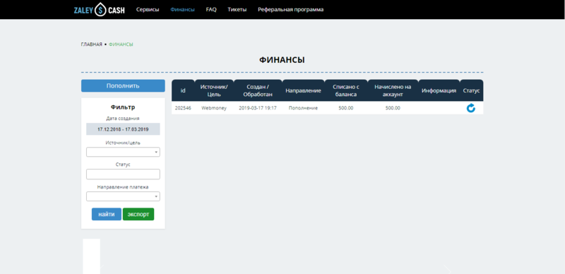 Перевести деньги на баланс сервиса можно через вкладку “Финансы”. Здесь же представлена вся статистика по переводам и их статусу. При помощи встроенного фильтра можно сортировать все операции ввода/вывода денег по дате, статусу, источнику платежа и т.п.