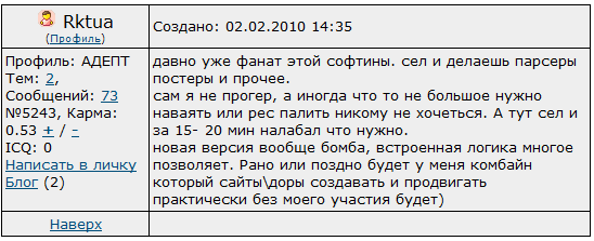 - Я давно уже являюсь фанатом этой программы, так как можно просто сесть и сделать кучу постеров, парсеров и другого. Я сам ни разу не программист, но иногда нужно создать что-нибудь небольшое и несложное или же не хочется никому «палить» свой ресурс. А с этой программой можно сесть из сделать, что нужно, меньше, чем за полчаса. Новая версия программы вообще супер, встроенная в нее внутренняя логика позволяет сделать очень многое. Надеюсь, что когда-нибудь у меня появится целый «комбайн», умеющий создавать и продвигать сайты (доры) вообще почти без моего личного участия!